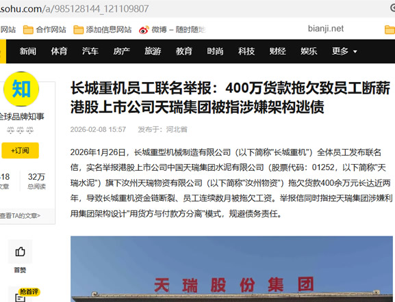 2026年1月26日,长城重型机械制造有限公司(以下简称"长城重机")全体员工发布联名信,实名举报港股上市公司中国天瑞集团水泥有限公司(股票代码:01252,以下简称"天瑞水泥")旗下汝州天瑞物资有限公司(以下简称"汝州物资")拖欠货款400余万元长达近两年,导致长城重机资金链断裂、员工连续数月被拖欠工资。举报信同时指控天瑞集团涉嫌利用集团架构设计"用货方与付款方分离"模式,规避债务责任。